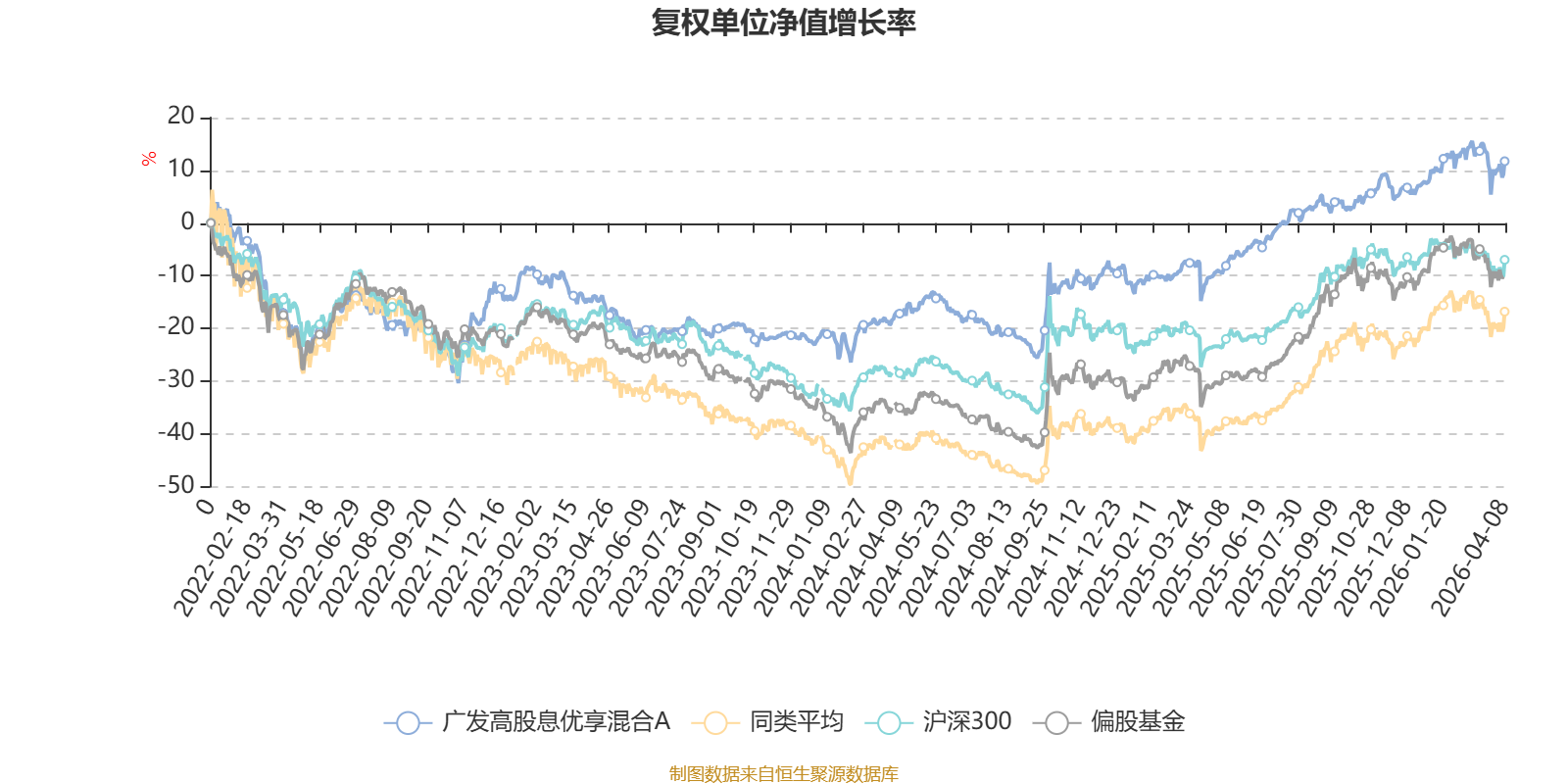 截至4月8日,广发高股息优享混合A近三个月复权单位净值增长率为2.07%,位于同类可比基金222/621;近半年复权单位净值增长率为8.70%,位于同类可比基金144/621;近一年复权单位净值增长率为29.12%,位于同类可比基金438/618;近三年复权单位净值增长率为29.56%,位于同类可比基金175/559。