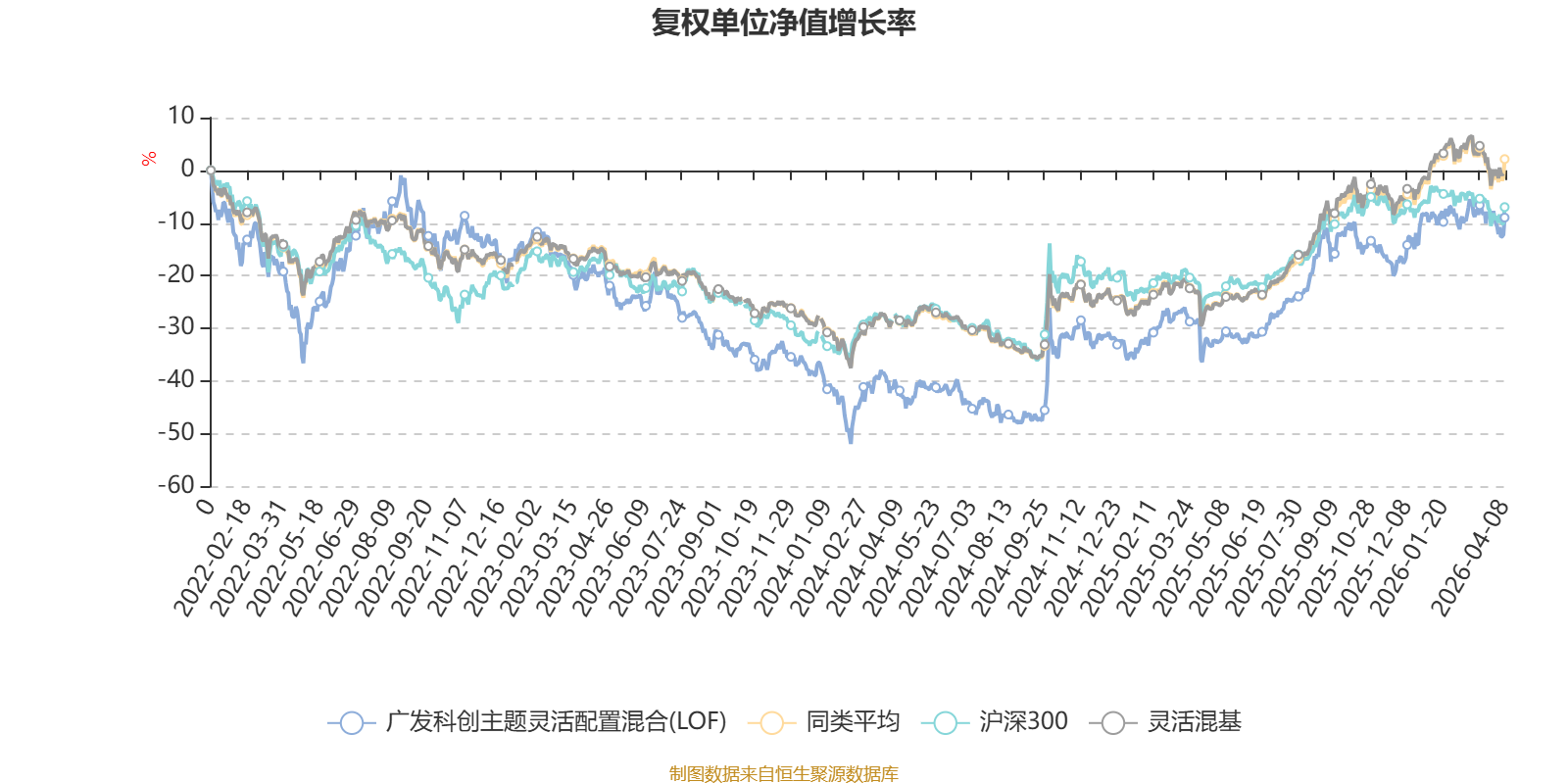截至4月8日,广发科创主题灵活配置混合(LOF)近三个月复权单位净值增长率为-0.60%,位于同类可比基金742/1287;近半年复权单位净值增长率为1.30%,位于同类可比基金752/1286;近一年复权单位净值增长率为43.06%,位于同类可比基金481/1286;近三年复权单位净值增长率为10.87%,位于同类可比基金708/1286。