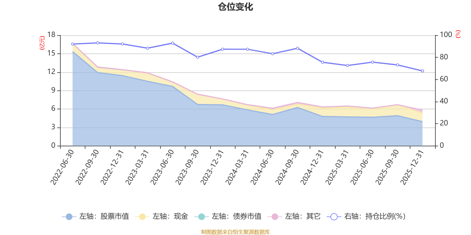 据定期报告数据统计,近三年平均股票仓位为81.05%,同类平均为72.57%。2022年三季度末基金达到93.1%的最高仓位,2025年末最低,为67.76%。