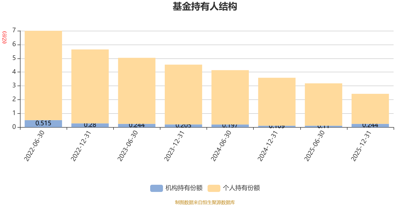 截至2025年12月31日,基金持有人共计1.63万户,合计持有2.42亿份。其中管理人员工持有7.2万份,占比0.03%,机构持有份额占比10.06%,个人投资者占比89.94%。