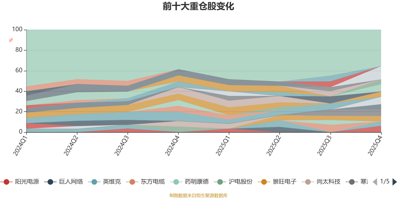 截至2025年末,基金十大重仓股分别是中际旭创、东山精密、新易盛、寒武纪、阳光电源、景旺电子、中钨高新、菲利华、迈为股份、英维克。