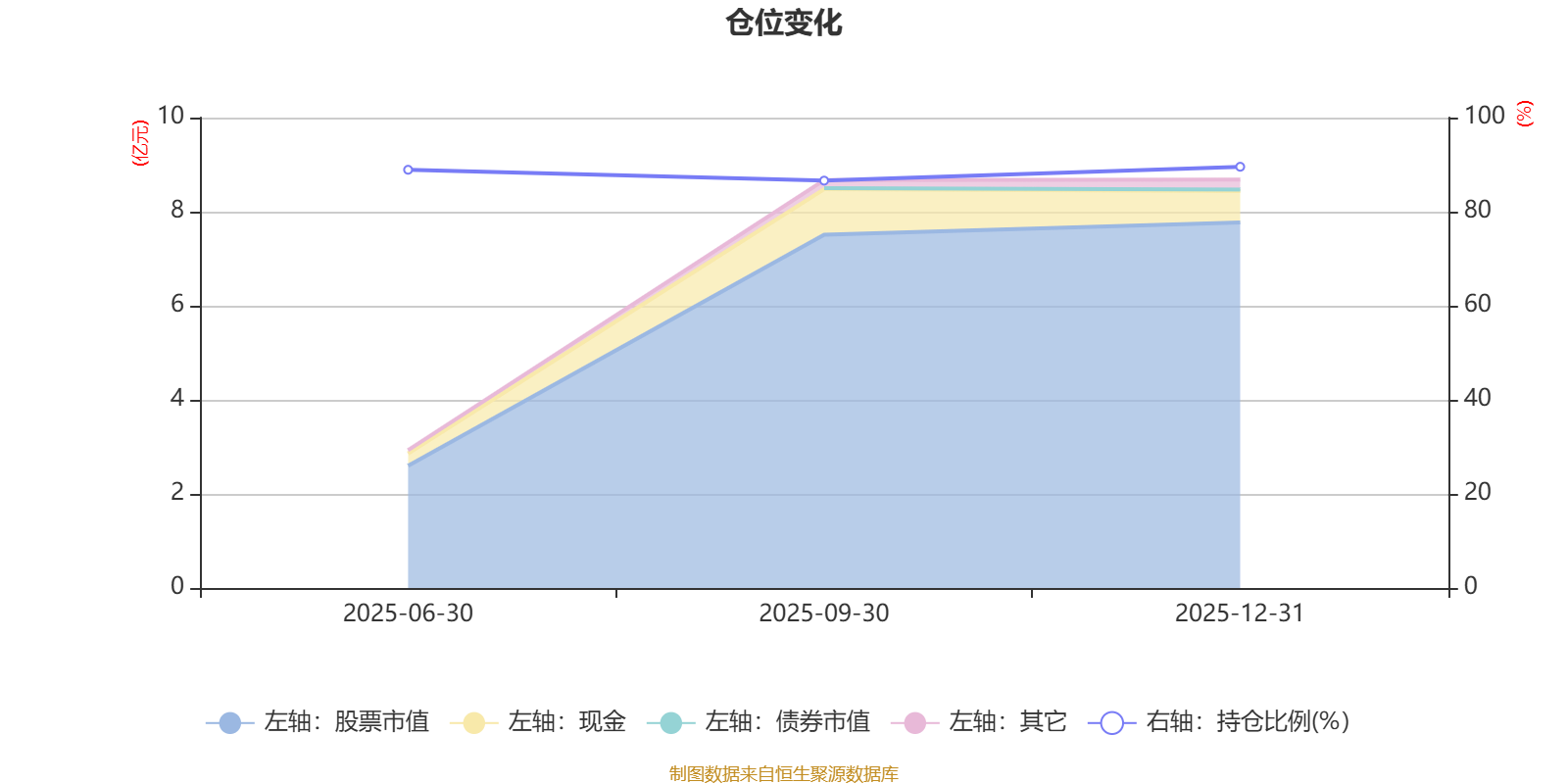 据定期报告数据统计,成立以来平均股票仓位为88.35%,同类平均为88.27%。2025年末基金达到89.55%的最高仓位,2025年三季度末最低,为86.6%。