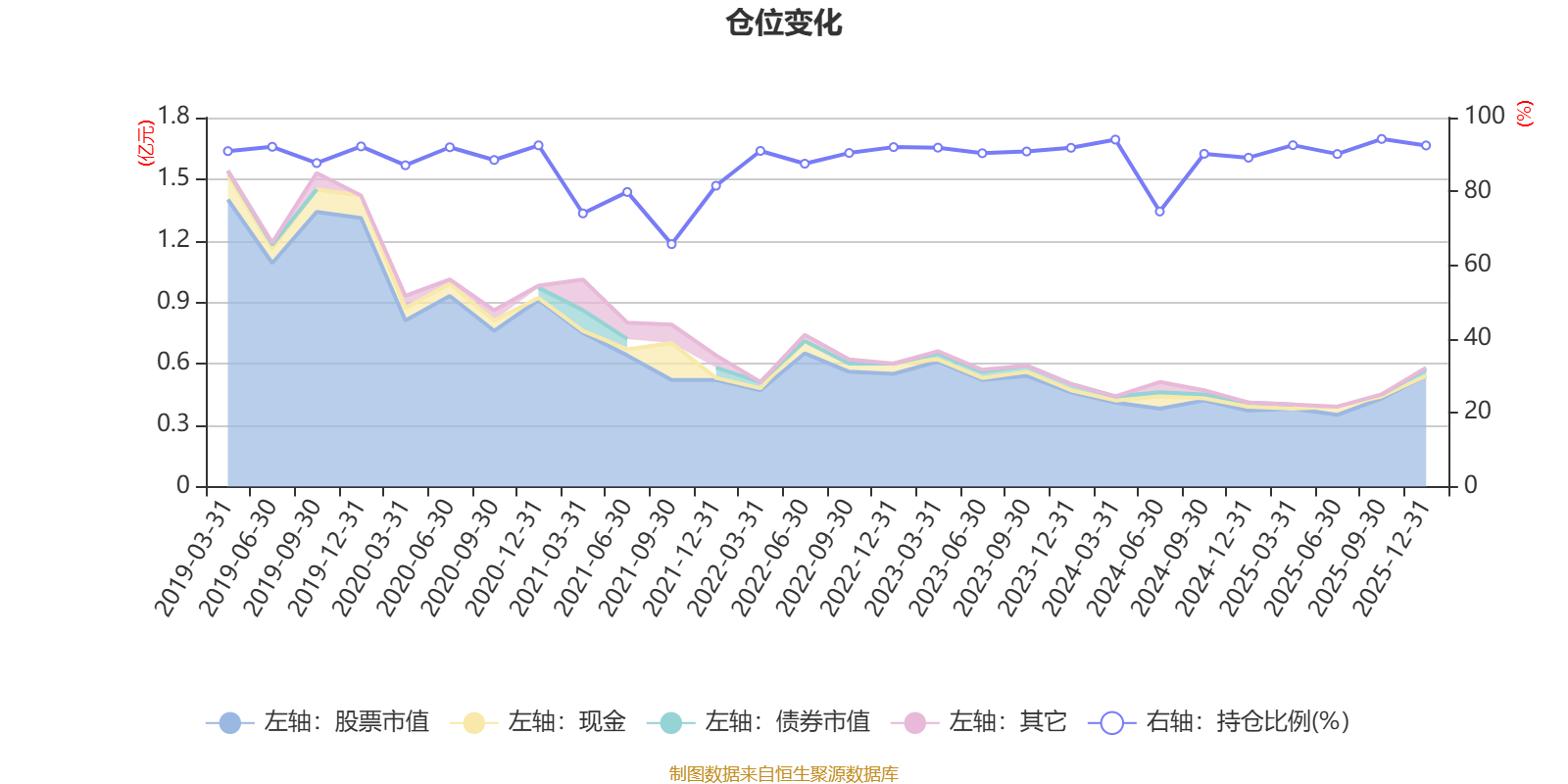据定期报告数据统计,近三年平均股票仓位为90.17%,同类平均为72.57%。2025年三季度末基金达到94.21%的最高仓位,2021年三季度末最低,为65.7%。