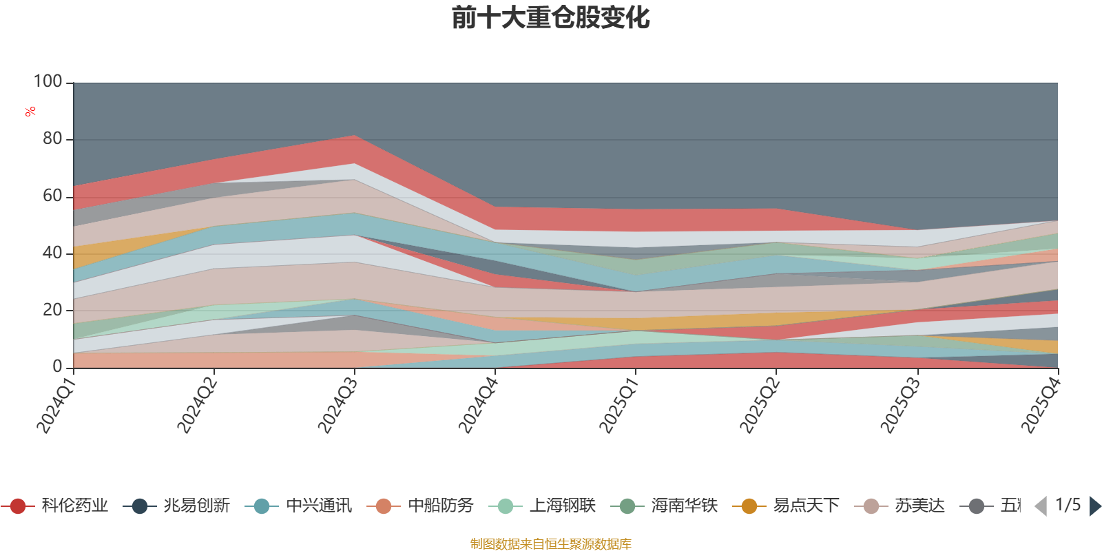 截至2025年末,基金十大重仓股分别是中国船舶、振华股份、兆易创新、伯特利、海天瑞声、分众传媒、易点天下、山东黄金、高能环境、方邦股份。