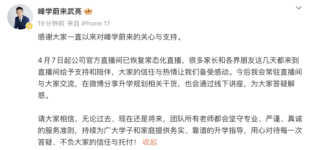 4月9日,峰学蔚来总经理@峰学蔚来武亮发文表示,4月7日起公司官方直播间已恢复常态化直播。