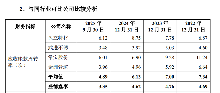 截至2025年9月底,盛德鑫泰短期借款为5.28亿元、长期借款为2.55亿元,均创下近年来新高。招股书(注册稿)把久立特材(002318)、常宝股份(002478)、武进不锈(603878)、金洲管道(002443)列为可比上市公司,公司资产负债率比上市公司平均值常年高30个百分点。