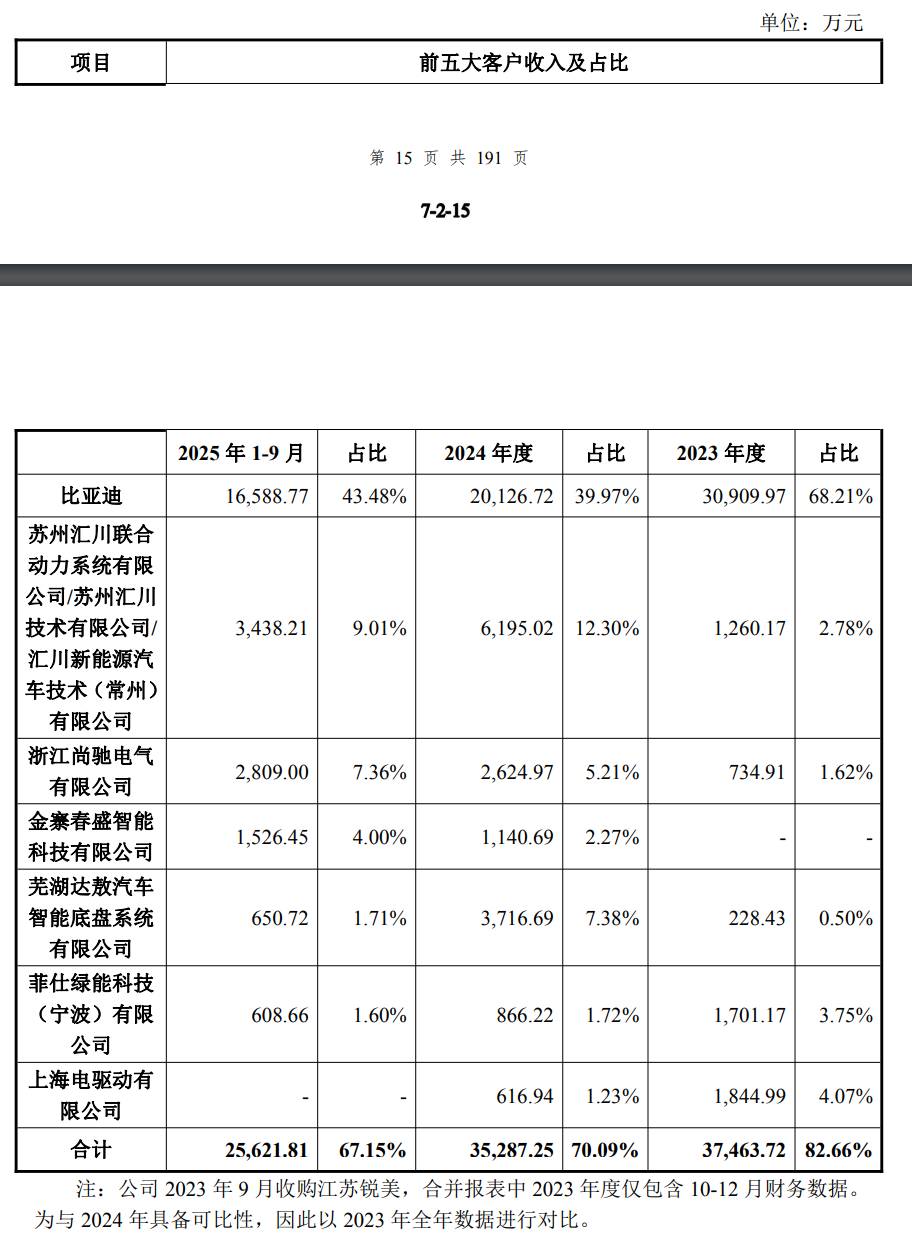 此外,江苏锐美对第一大客户比亚迪的销售也存在较大不确定性。据可转债回复函,2023-2025年1-9月,江苏锐美对比亚迪的销售额分别为3.09亿元、2.01亿元和1.66亿元,占营收之比分别为68.21%、39.97%和43.48%。江苏锐美对比亚迪的销售,在经历了2023年的高峰后,2024年出现了较大程度的下滑。