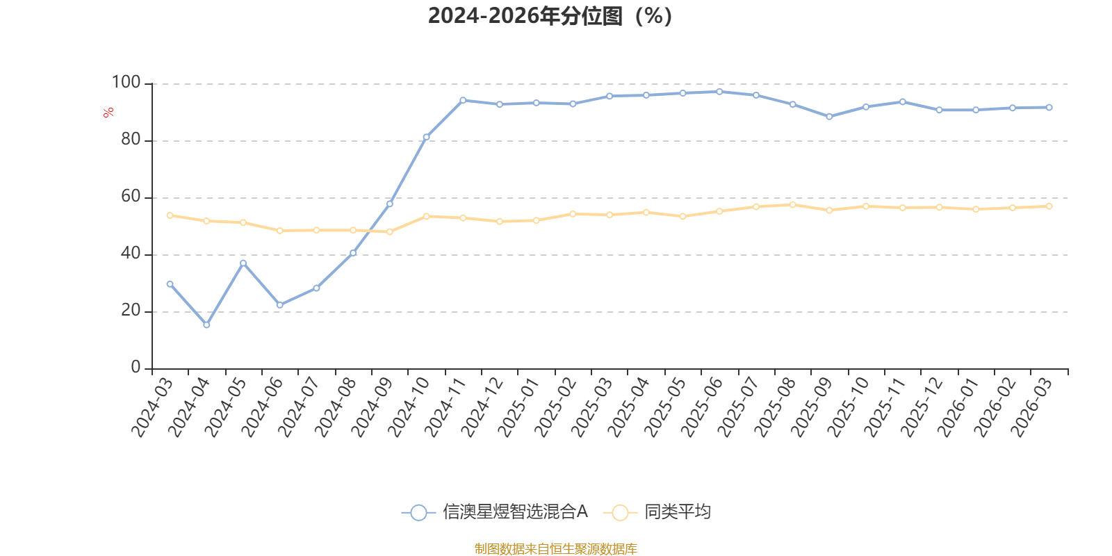 通过所选区间该基金净值增长率分位图,可以观察该基金与同类基金业绩比较情况。图为坐标原点到区间内某时点的净值增长率在同类基金中的分位数。