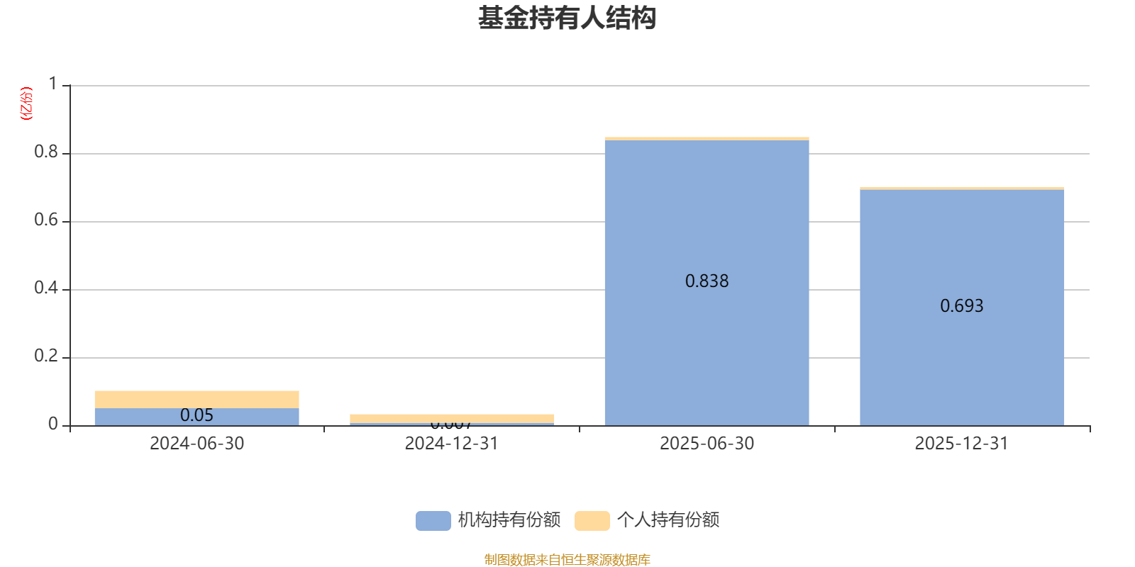 截至2025年12月31日,基金持有人共计102户,合计持有6999.75万份。其中管理人员工持有3.13万份,占比0.04%,机构持有份额占比99.05%,个人投资者占比0.95%。