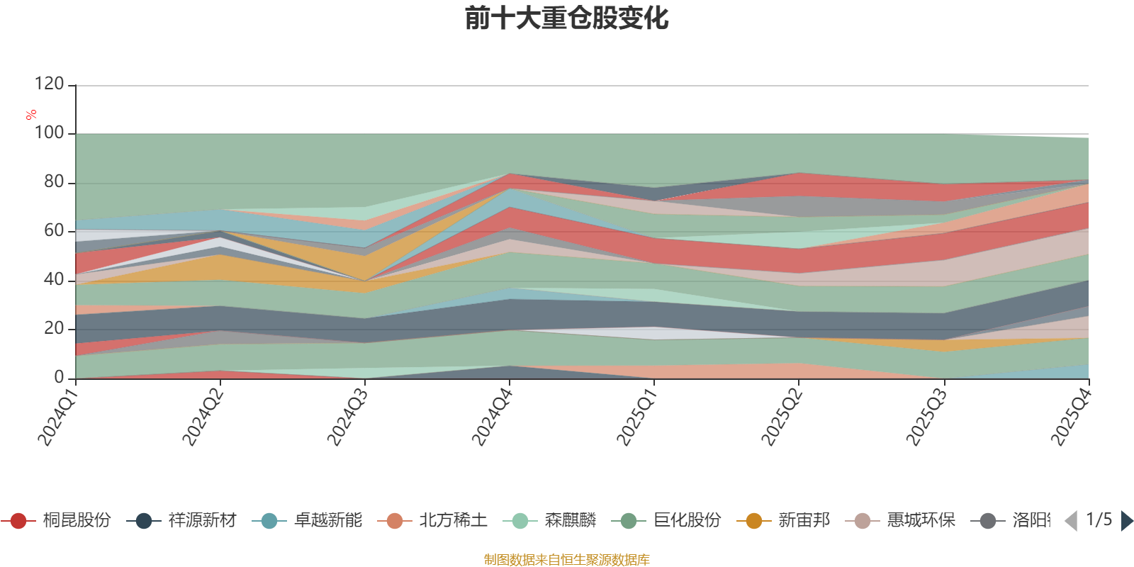 该基金持股集中度较高,近2年前十大重仓股集中度长期超过60%。截至2025年末,基金十大重仓股分别是巨化股份、东岳集团、三美股份、昊华科技、永和股份、惠城环保、广东宏大、卓越新能、华友钴业、山东黄金。