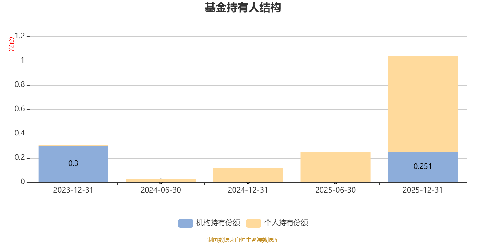 截至2025年12月31日,基金持有人共计6392户,合计持有1.04亿份。其中管理人员工持有23.64万份,占比0.23%,机构持有份额占比24.21%,个人投资者占比75.79%。