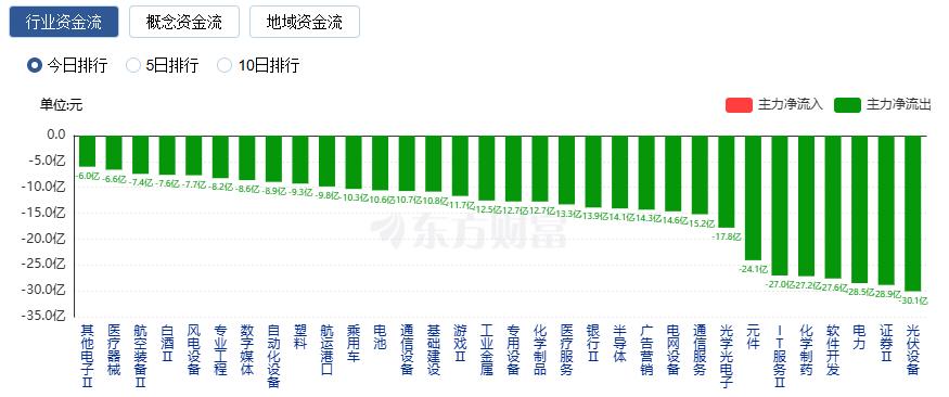 净流出方面,光伏设备、证券、电力等净流出排名靠前,其中光伏设备净流出30.08亿元。