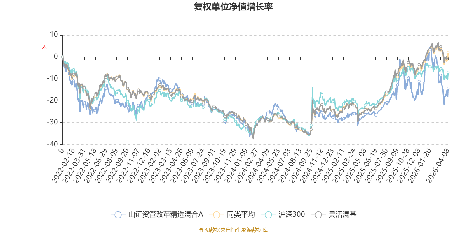 截至4月8日,山证资管改革精选混合A近三个月复权单位净值增长率为-12.87%,位于同类可比基金1258/1287;近半年复权单位净值增长率为-12.60%,位于同类可比基金1222/1286;近一年复权单位净值增长率为23.43%,位于同类可比基金847/1286;近三年复权单位净值增长率为-2.44%,位于同类可比基金1010/1286。