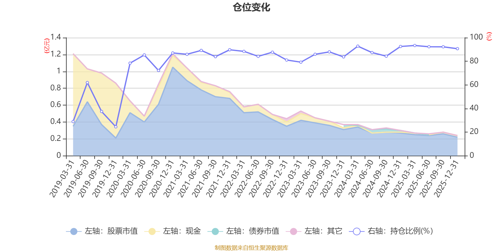 据定期报告数据统计,近三年平均股票仓位为88.54%,同类平均为72.57%。2025年一季度末基金达到93.35%的最高仓位,2019年末最低,为24.51%。