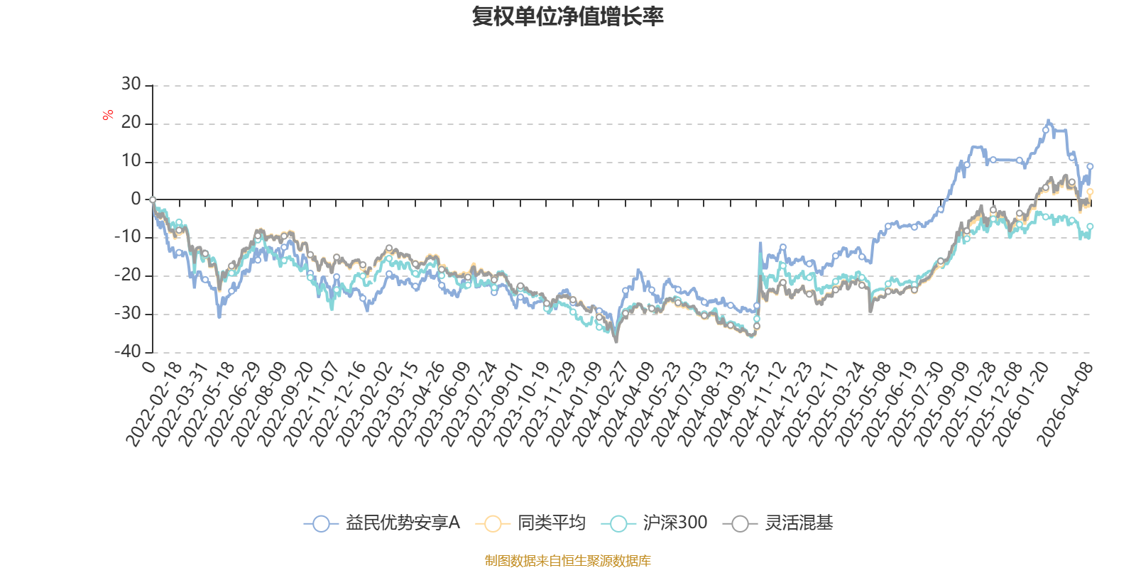 截至4月8日,益民优势安享A近三个月复权单位净值增长率为-4.55%,位于同类可比基金1058/1287;近半年复权单位净值增长率为-4.47%,位于同类可比基金1064/1286;近一年复权单位净值增长率为30.52%,位于同类可比基金694/1286;近三年复权单位净值增长率为32.98%,位于同类可比基金314/1286。