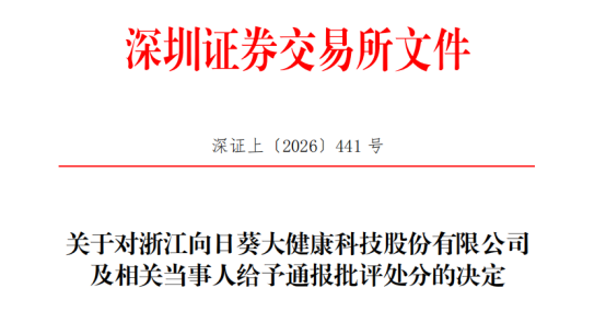 通报明确,鉴于违规事实及情节,对向日葵给予通报批评的处分;对董事长吴少钦、董事会秘书李岚给予通报批评的处分。对于向日葵及相关当事人上述违规行为及给予的处分,深圳证券交易所将记入证券期货市场诚信档案数据库。