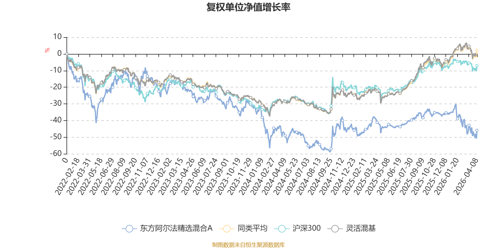 截至4月8日,东方阿尔法精选混合A近三个月复权单位净值增长率为-19.02%,位于同类可比基金1282/1287;近半年复权单位净值增长率为-18.78%,位于同类可比基金1269/1286;近一年复权单位净值增长率为2.52%,位于同类可比基金1233/1286;近三年复权单位净值增长率为-31.35%,位于同类可比基金1264/1286。