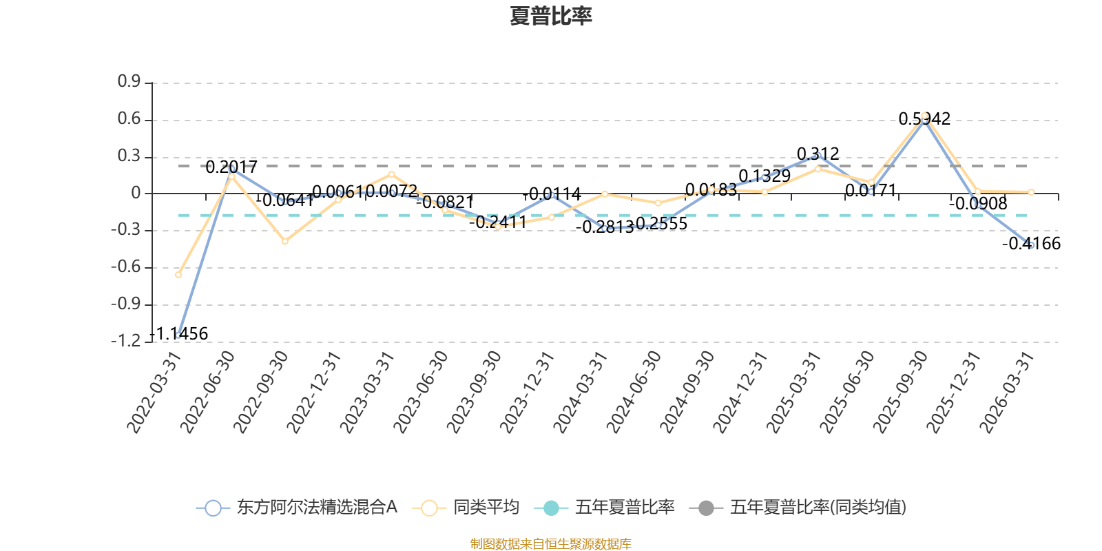 截至3月31日,基金近三年夏普比率为-0.1992,位于同类可比基金1224/1274。