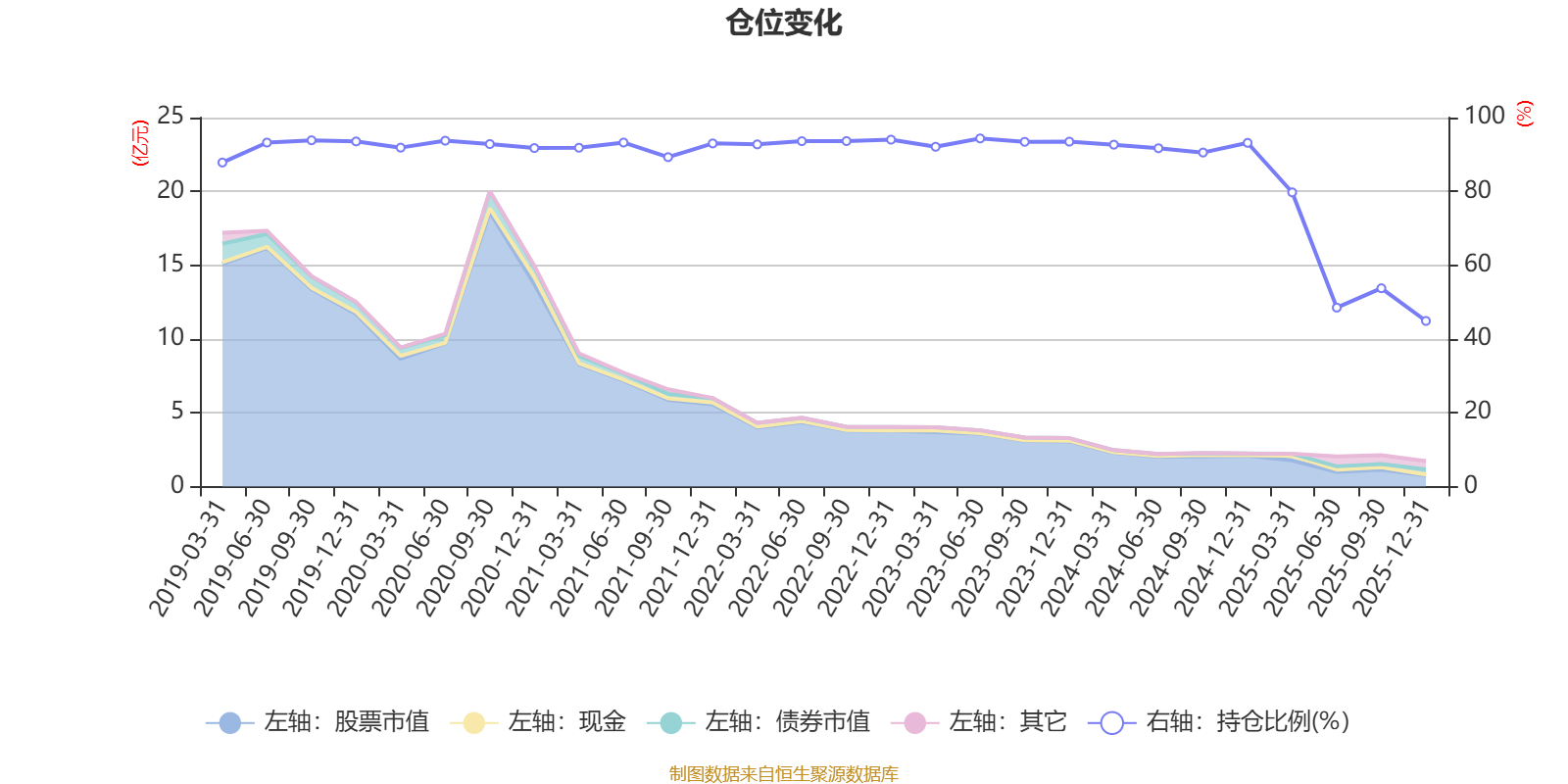 据定期报告数据统计,近三年平均股票仓位为80.69%,同类平均为72.57%。2023年上半年末基金达到94.35%的最高仓位,2025年末最低,为44.89%。