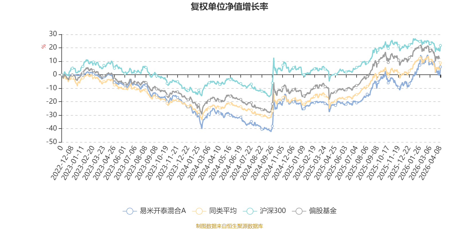 截至4月8日,易米开泰混合A近三个月复权单位净值增长率为6.94%,位于同类可比基金100/689;近半年复权单位净值增长率为4.62%,位于同类可比基金289/689;近一年复权单位净值增长率为44.85%,位于同类可比基金290/685;近三年复权单位净值增长率为4.84%,位于同类可比基金258/417。