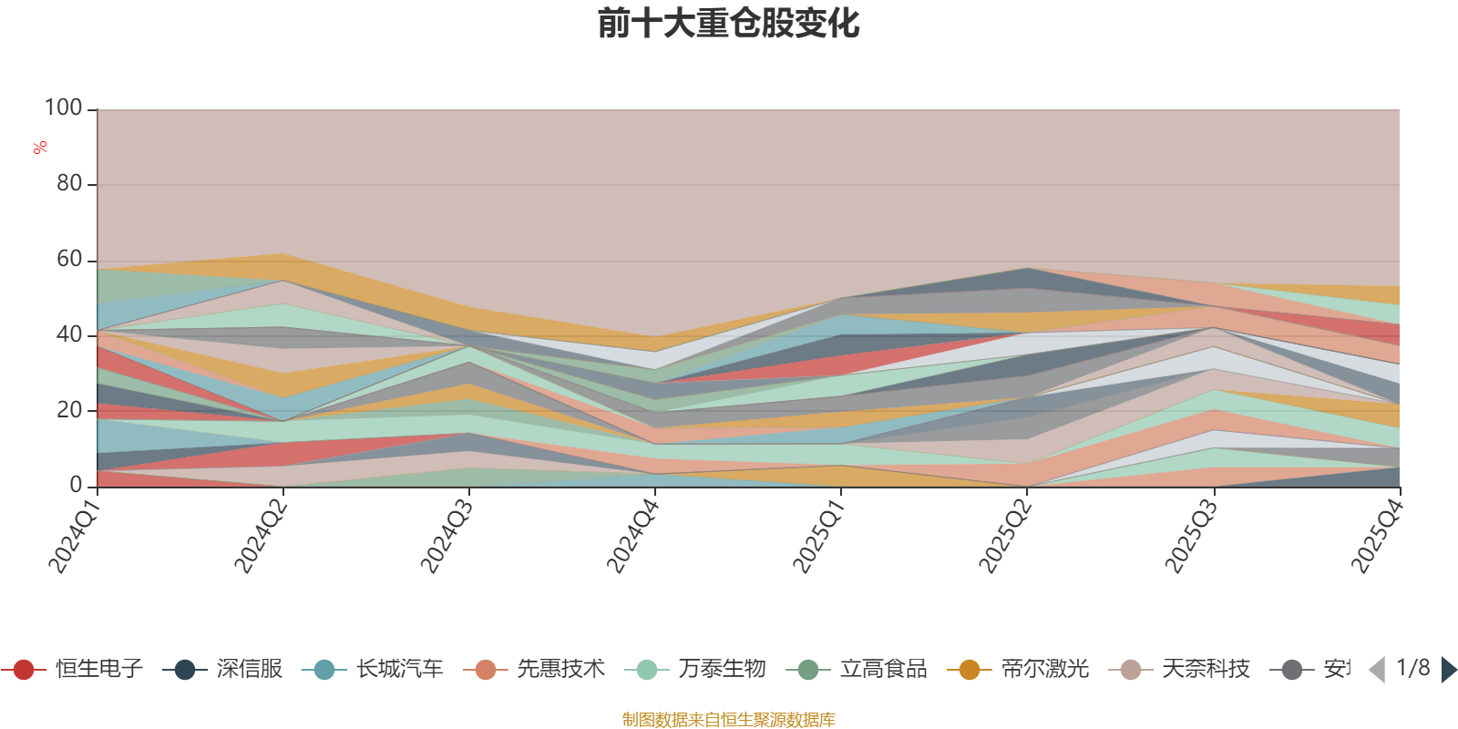 截至2025年末,基金十大重仓股分别是绿的谐波、伟创电气、东威科技、思瑞浦、盛科通信、深信服、胜宏科技、中芯国际、安培龙、乐鑫科技。