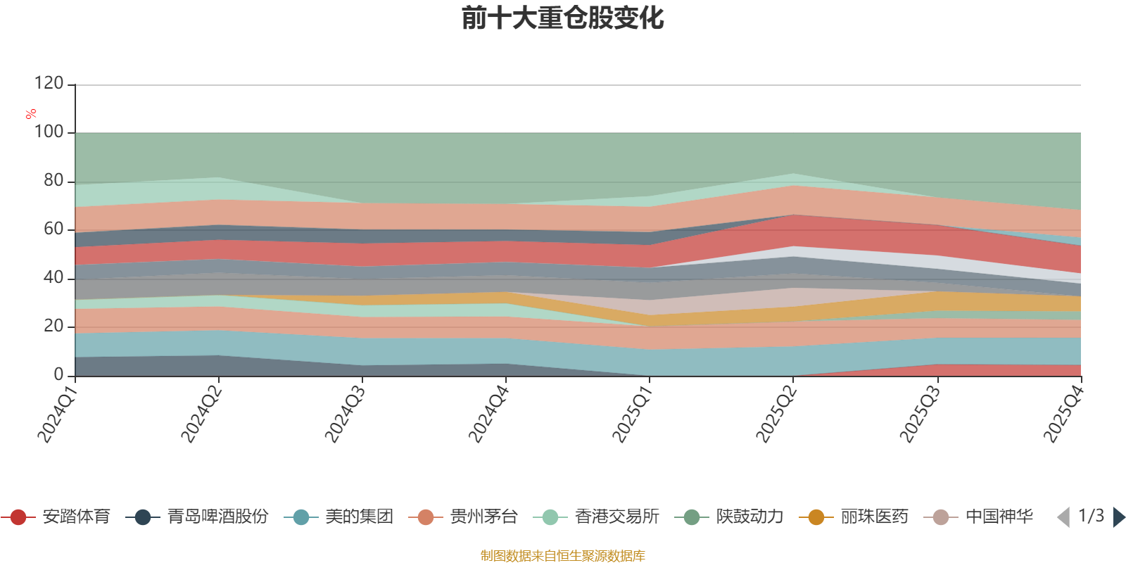 该基金持股集中度较高,近2年前十大重仓股集中度长期超过60%。截至2025年末,基金十大重仓股分别是快手-W、腾讯控股、美的集团、贵州茅台、丽珠医药、五粮液、安踏体育、阿里巴巴-W、陕鼓动力、联想集团。