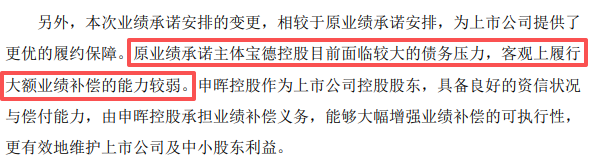 需要指出,同日的补充法律意见书显示,“本次业绩承诺安排的变更,相较于原业绩承诺安排,为上市公司提供了更优的履约保障。原业绩承诺主体宝德控股目前面临较大的债务压力,客观上履行大额业绩补偿的能力较弱。”
