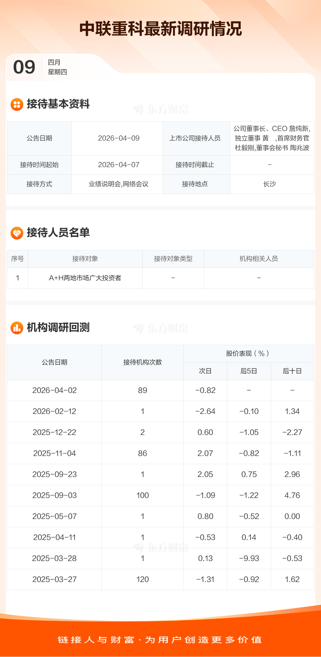 中联重科4月9日公告称,4月7日接待A+H两地市场广大投资者等1家机构调研。接待人员包括公司董事长、CEO 詹纯新,独立董事 黄珺,首席财务官 杜毅刚,董事会秘书 陶兆波。