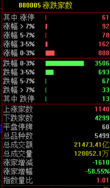 两市共1140只个股上涨,61只个股涨停,4299只个股下跌。