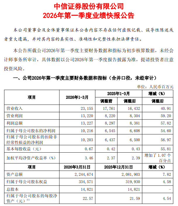 中信证券业绩快报:一季度净利润102亿元 同比增长54.6%