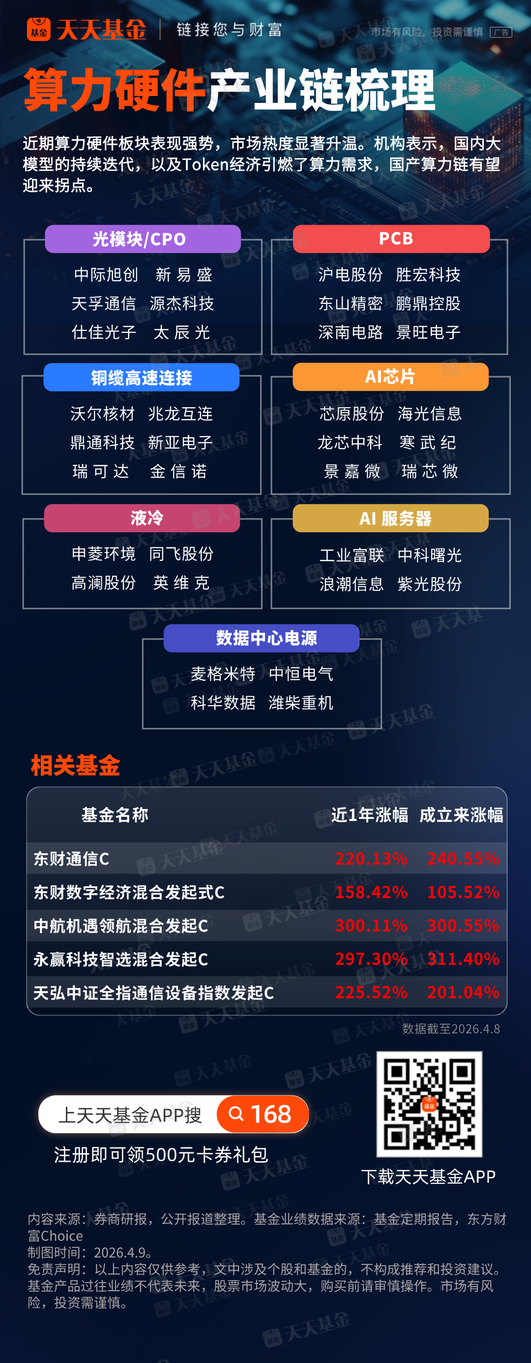 上海证券表示,国内大模型的持续迭代,以及Token经济引燃了算力需求,国产算力链有望迎来拐点。个股而言,算力产业链中算力芯片(寒武纪、海光信息);光通信(中际旭创、新易盛、天孚通信等);AIDC供应商(宝信软件、润泽科技、光环新网等);液冷(英维克、申菱环境、网宿科技等)较受市场关注。