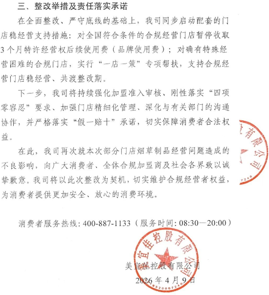 此外,美宜佳再次就本次部分门店烟草制品经营问题造成的不良影响,向广大消费者、全体合规加盟商及社会各界致以诚挚歉意。