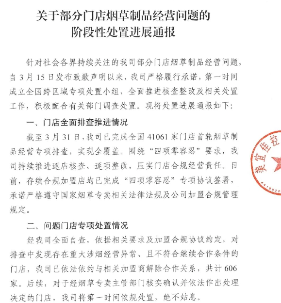 【大河财立方消息】4月9日,美宜佳发布关于部分门店烟草制品经营问题的阶段性处置进展通报。
