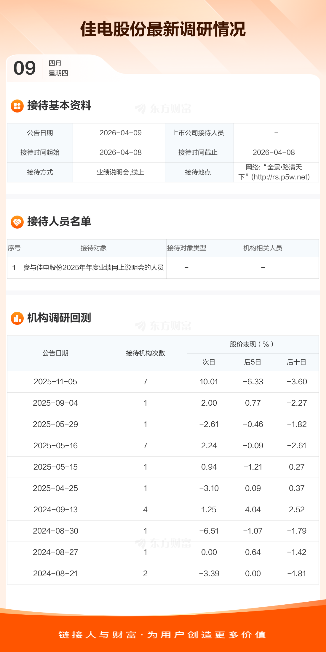 佳电股份4月9日公告称,4月8日接待参与佳电股份2025年年度业绩网上说明会的人员等1家机构调研。