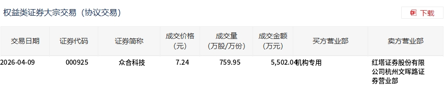 众合科技今日大宗交易溢价成交759.95万股,成交额5502.04万元