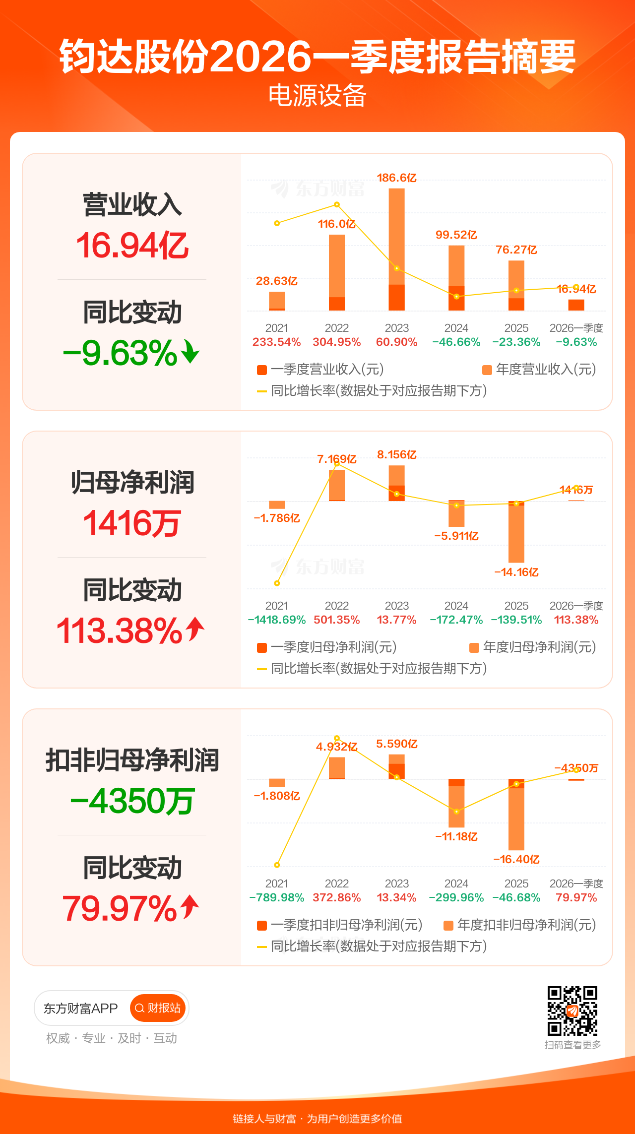 钧达股份4月10日发布2026年一季报显示,公司一季度实现营业收入16.94亿元,同比下滑9.63%;归母净利润1416.36万元,同比增长113.38%;扣非归母净利润-4350.32万元。
