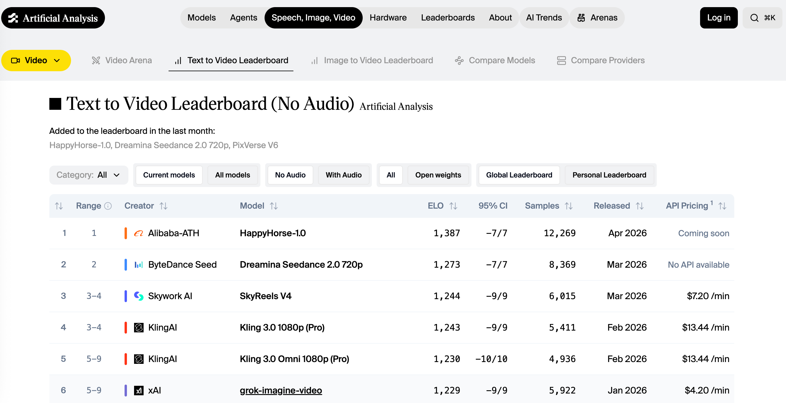 近日,在权威第三方评测平台 Artificial Analysis 的 Video Arena 榜单上,HappyHorse-1.0以1387分位列第一,领先字节跳动Dreamina Seedance 2.0等模型,登顶文生视频、图生视频双赛道榜首。样本量达1.2万以上,已具备较高统计稳定性。