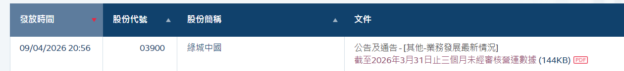 4月9日,绿城中国控股有限公司(股票代码:03900.HK)发布截至2026年3月31日止三个月未经审核营运数据。公告显示,2026年第一季度,绿城集团累计取得总合同销售面积约176万平方米,总合同销售金额约人民币386亿元,这一数据与去年同期相比出现了约26.34%的下滑。