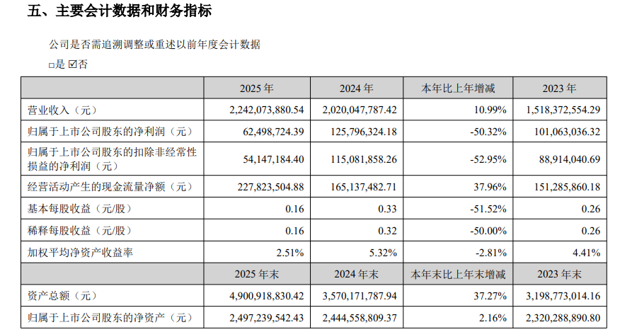 4月9日晚间,浙江永贵电器股份有限公司(300351.SZ)披露2025年年度报告,公司全年实现营业收入22.42亿元,同比增长10.99%,但归母净利润却骤降至6249.87万元,同比腰斩50.32%;扣非净利润仅5414.72万元,同比暴跌52.95%。第四季度公司更是陷入亏损——归母净利润-870.80万元,扣非净利润-1178.14万元。