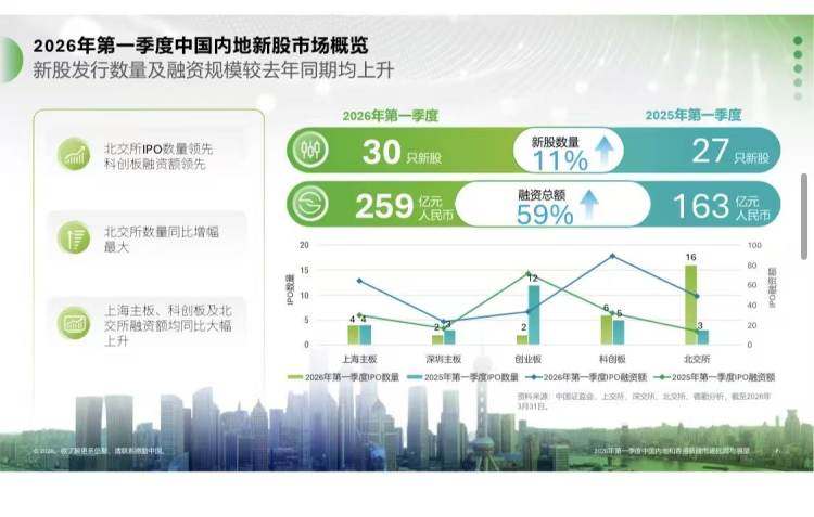 报告显示,受益于各项资本市场改革措施,2026年第一季度,中国内地新股市场在融资规模、新股数量、前五大IPO的融资额以及企业申请上市和上会数量等方面,均较2025年第一季度有所增长。其中,A股市场共有30只新股上市,融资总额达259亿元人民币,同比分别增长11%和59%。