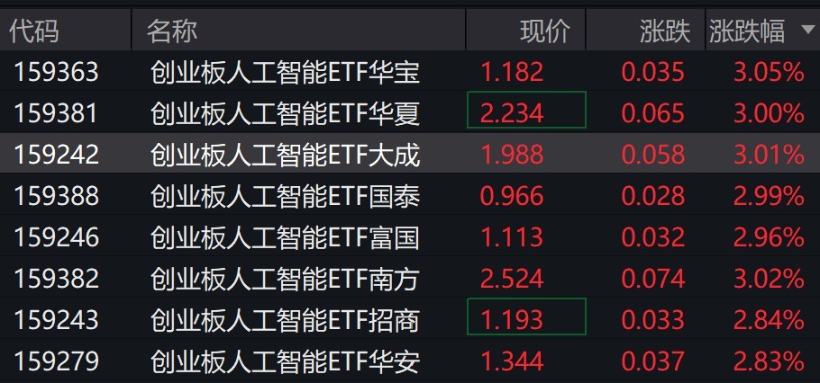 受盘面影响,创业板人工智能相关ETF涨约3%。