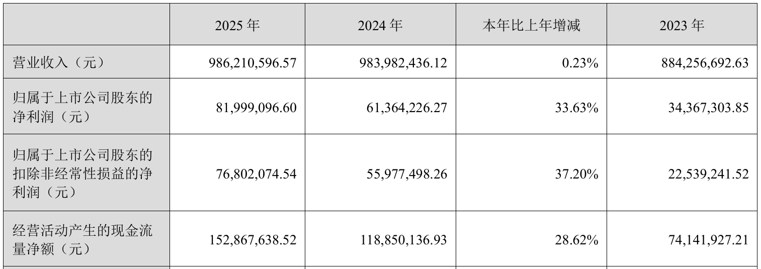 日前,乐心医疗(300562)发布2025年年报。报告显示,公司2025年营业收入为9.86亿元,同比增长0.23%;归母净利润为8199.91万元,同比增长33.63%;扣非归母净利润为7680.21万元,同比增长37.20%。