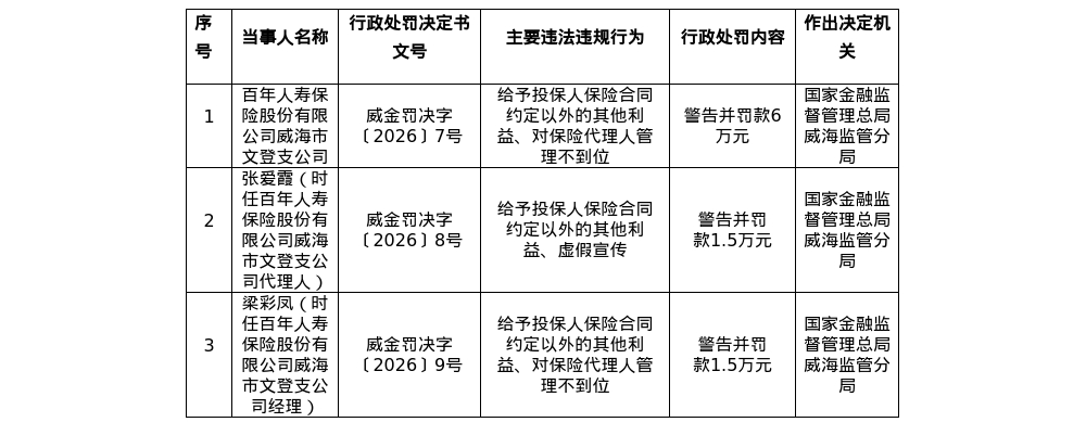 此外,百年人寿保险股份有限公司威海市文登支公司因给予投保人保险合同约定以外的其他利益、对保险代理人管理不到位,被警告并处罚款6万元。代理人张爱霞、经理梁彩凤,分别被警告并处罚款1.5万元。