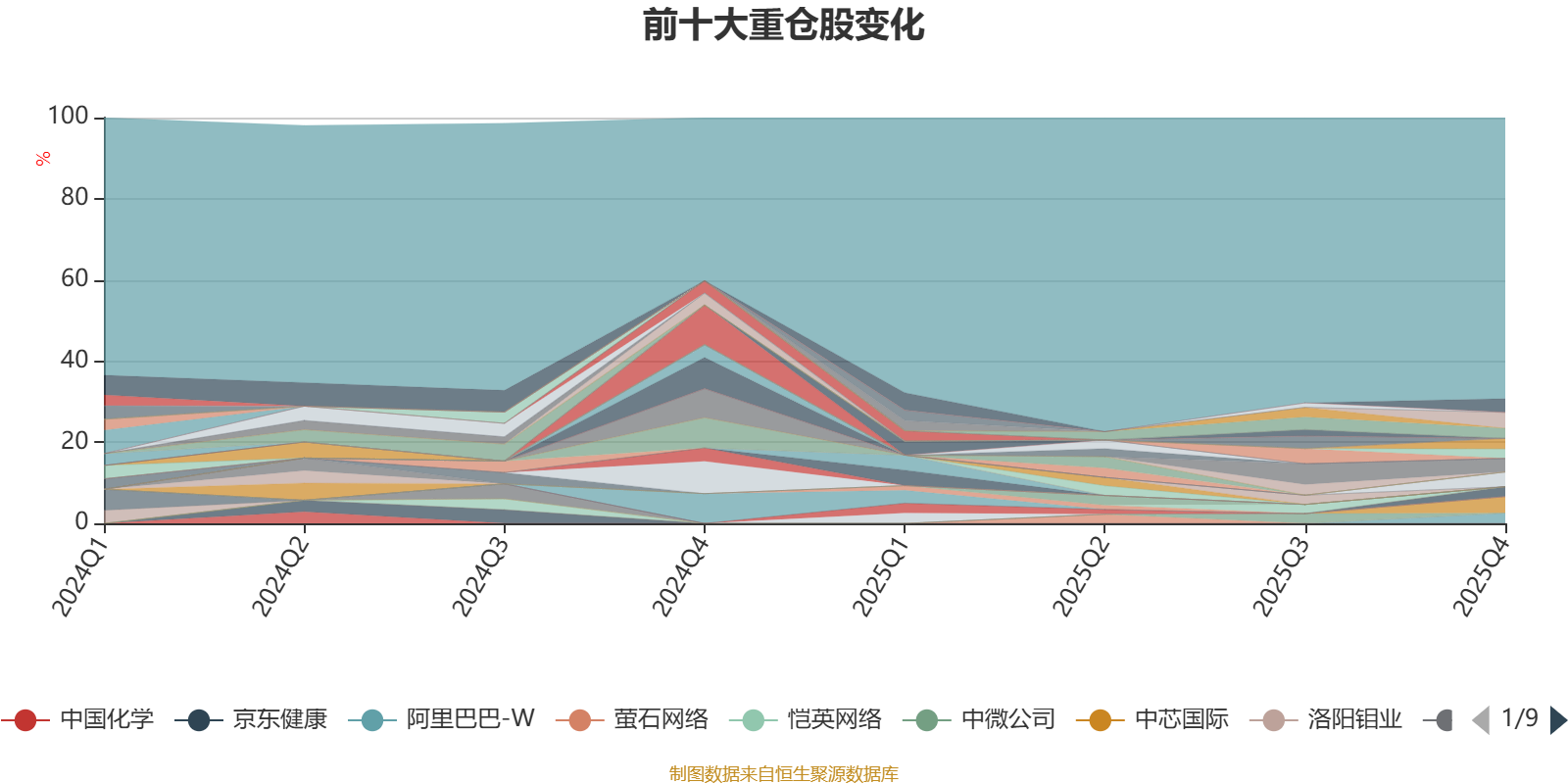 截至2025年末,基金重仓股分别是中芯国际、华虹公司、海光信息、顺丰控股、寒武纪、腾讯控股、阿里巴巴-W、拓普集团、绿的谐波、锦浪科技、华虹半导体。