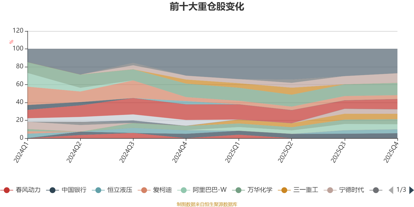 该基金持股集中度较高,近2年前十大重仓股集中度长期超过60%。截至2025年末,基金十大重仓股分别是招商银行、华峰铝业、紫金矿业、三一重工、万华化学、阿里巴巴-W、中国银行、宁德时代、星宇股份、恒立液压。