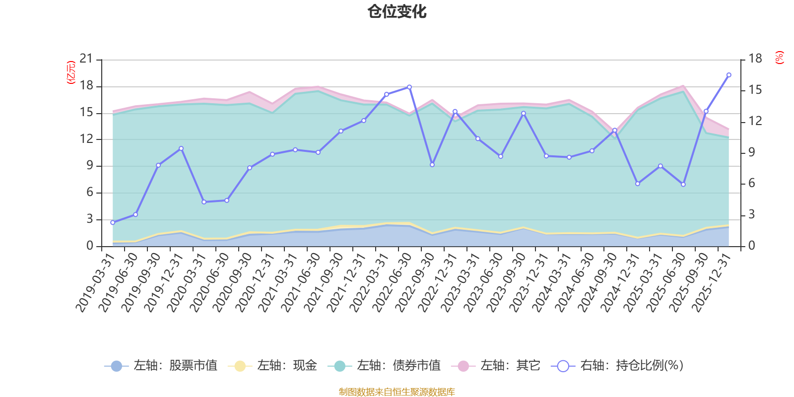 据定期报告数据统计,近三年平均股票仓位为9.91%,同类平均为72.57%。2025年末基金达到16.52%的最高仓位,2019年一季度末最低,为2.3%。