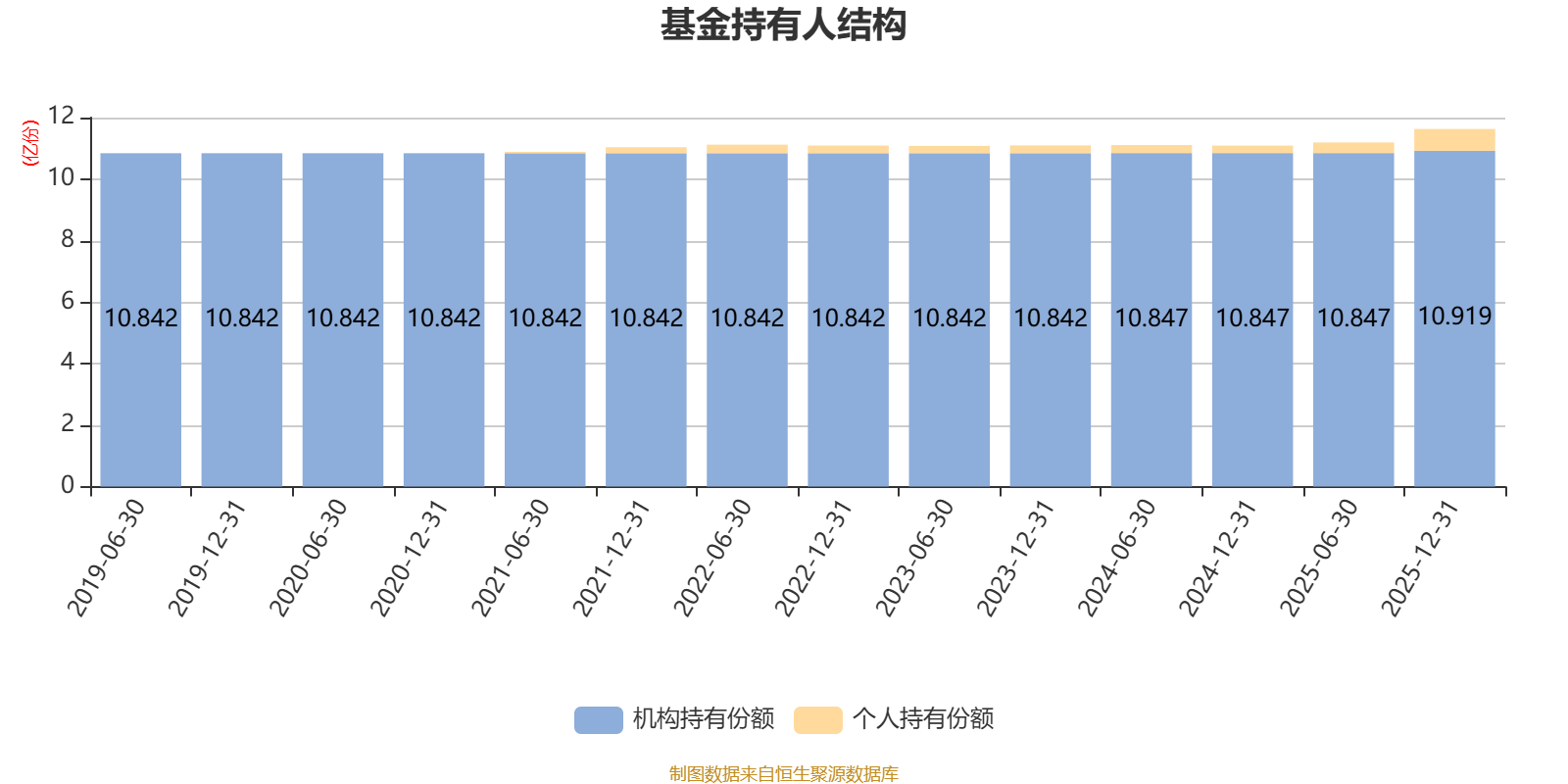 截至2025年12月31日,基金持有人共计526户,合计持有11.63亿份。其中管理人员工持有332.93万份,占比0.29%,机构持有份额占比93.89%,个人投资者占比6.11%。