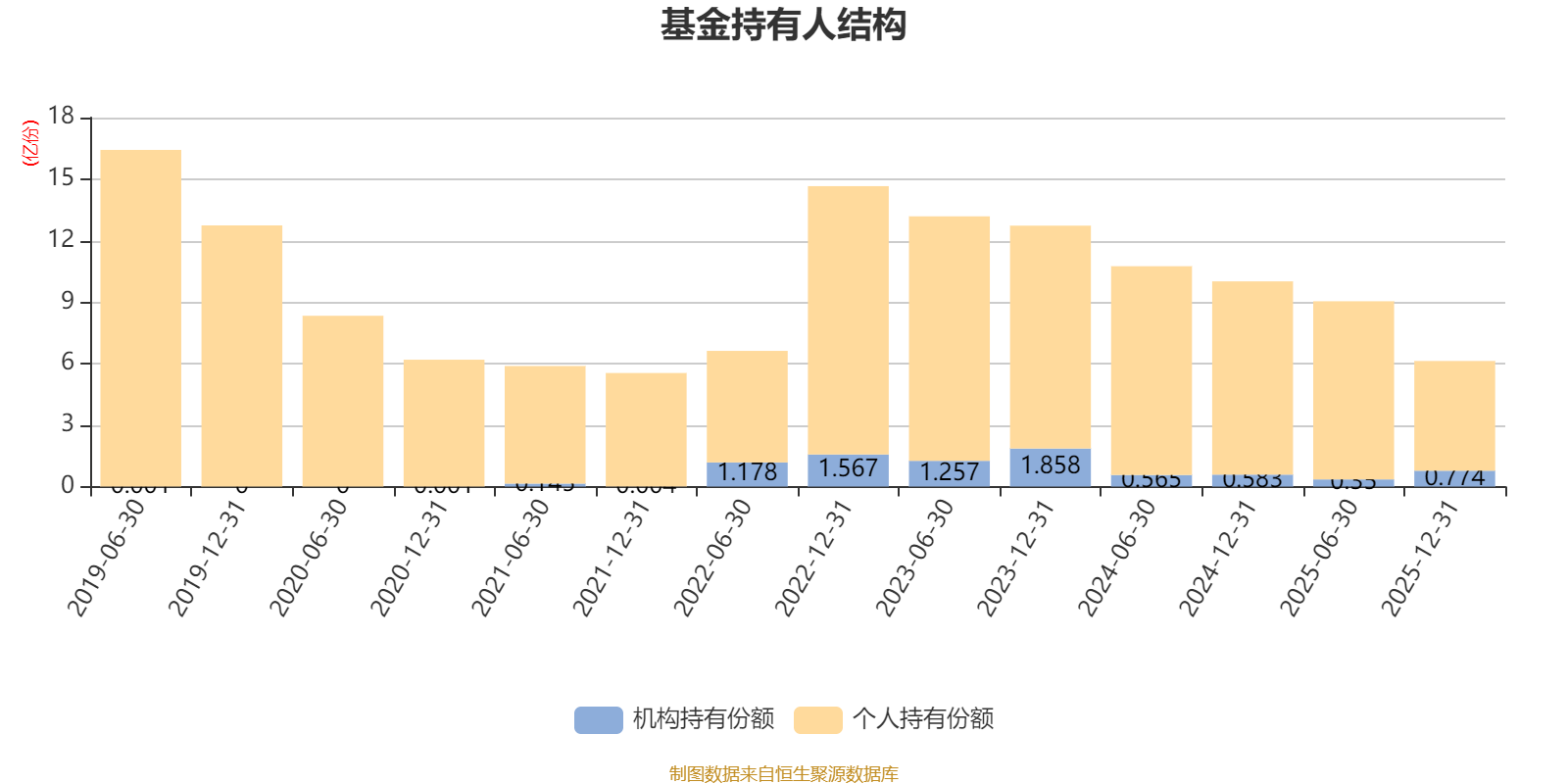 截至2025年12月31日,基金持有人共计6.38万户,合计持有6.13亿份。其中管理人员工持有803.54万份,占比1.31%,机构持有份额占比12.64%,个人投资者占比87.36%。