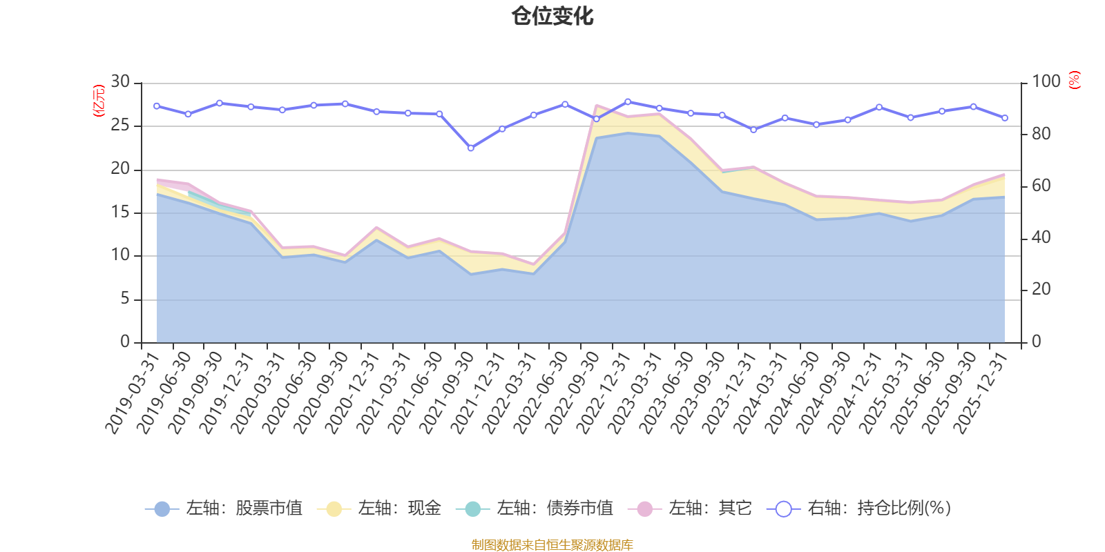 据定期报告数据统计,近三年平均股票仓位为87.31%,同类平均为87.64%。2022年末基金达到92.71%的最高仓位,2021年三季度末最低,为74.88%。