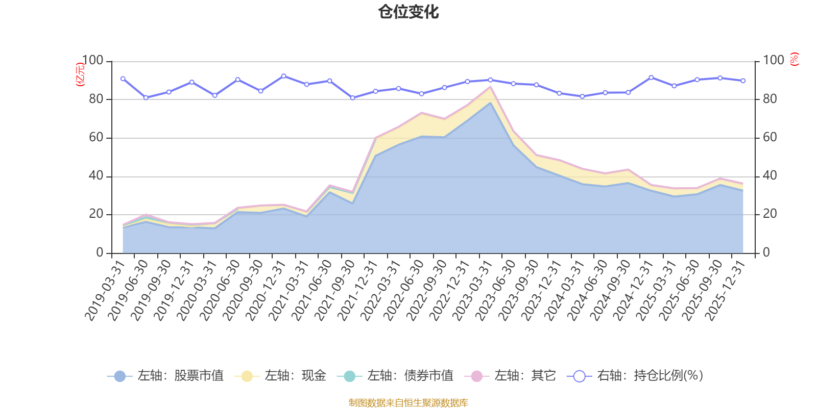 据定期报告数据统计,近三年平均股票仓位为87.4%,同类平均为72.57%。2020年末基金达到92.26%的最高仓位,2021年三季度末最低,为80.93%。